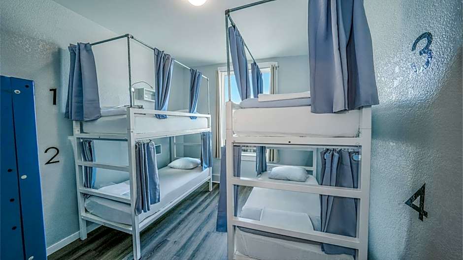 This is a coed dorm room that sleeps 8 people and shares a washroom.
