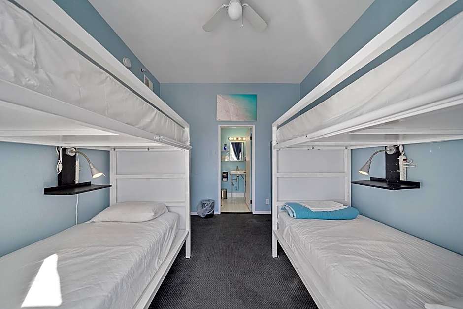 This is a coed dorm room that sleeps 8 people and shares a washroom.